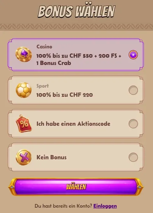 - Willkommensbonus wählen: Dies ist ein entscheidender Moment. Sie werden gefragt, welchen Bonus Sie beanspruchen möchten: den Casino Willkommensbonus oder den Sport Willkommensbonus. Treffen Sie Ihre Wahl sorgfältig, da dies Ihre erste Einzahlung massgeblich beeinflusst.